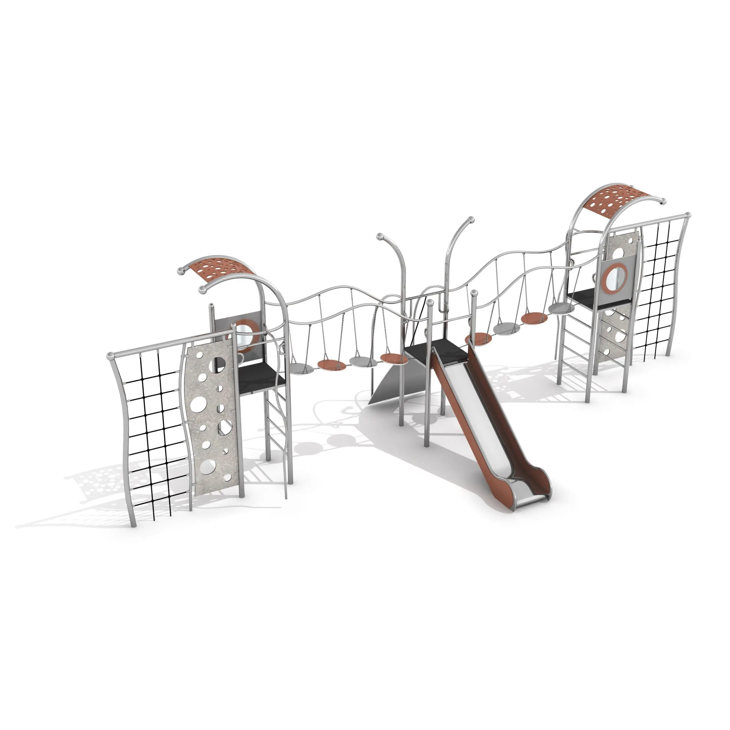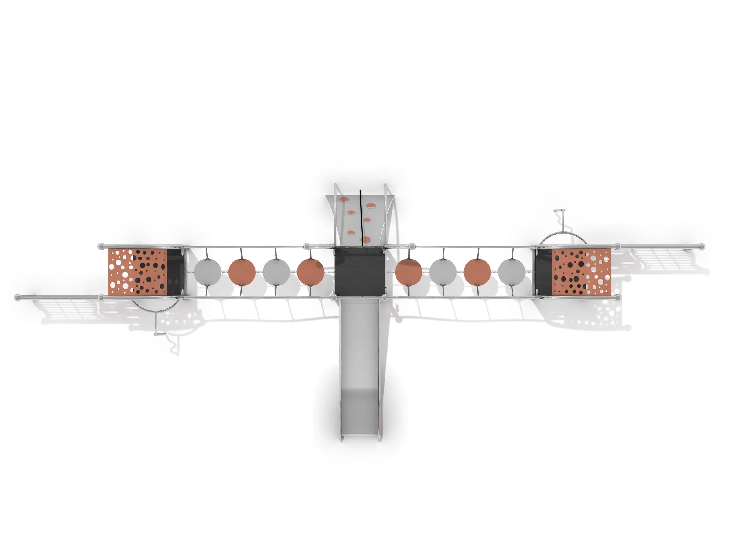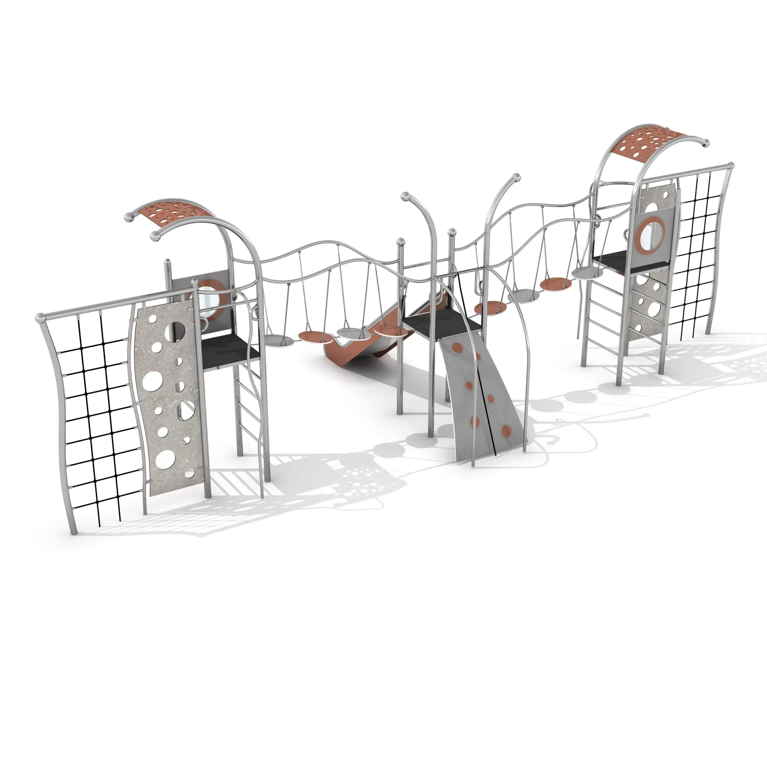 Konstruksjon i rustfritt stål. Glide- og håndlister på vognen er laget av rustfritt stål. Plattformer laget av HPL-materiale. Tak, inngangsrampe, sider av sklien, klatrevegger, brohjul, paneler laget av HDPE-materiale.
