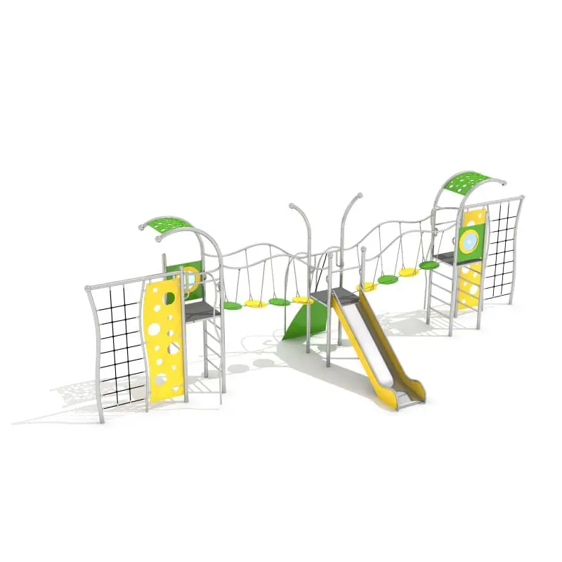 En fargerik lekestruktur med to tårn, sklie, bro og gjennombrutt tak. Designet er inspirert av formen til en snegl. Konstruksjonen er sveiset i rustfritt stål med høy ytelse og er værbestandig (ingen klemmer brukes). Stolpene er avsluttet med kuleformede dekorative elementer som får enheten til å ligne sneglehorn. Veggene på sklien, tårnet og rekkverkene er laget av HDPE-plater. Gulvet er laget av HPL-plater med sklisikker tekstur, noe som sikrer trygg bruk og forhindrer at det varmes opp i solen og fryser lett om vinteren. Lekeplassen oppfyller EN 1176-standarden.