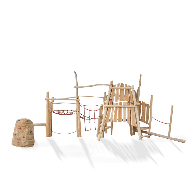 Klatresystem med 4 plattformer, klatrerampe med håndtak, sklie, klatrenett og skråstilt gangbro