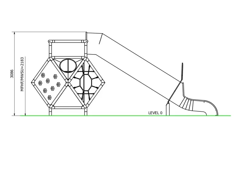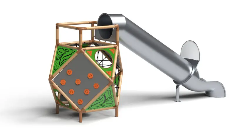 SFERO FOREST 1-2 er en lekeplassattraksjon som kombinerer klatring og skliing i et naturlig design. Den består av en sfærisk modul og en rett rørsklie. Den stabile stålkonstruksjonen er kamuflert i jordfarger (RAL 1011/8003) med dekorative elementer i grønn HDPE. Klatrenett, ramper og paneler er inkludert. Perfekt balanse mellom estetikk og lekeverdi. Fargetema: Beige/Brun/Grønn (Forest).