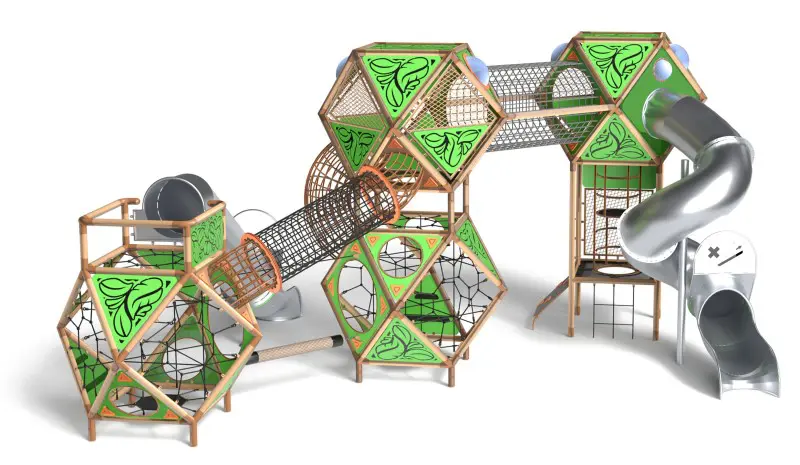 SFERO FOREST 4-1 er et omfattende lekesystem med fire baller og to sklier med naturtema. Den komplekse designen oppmuntrer til gjemsel og sosialt samspill. Strukturen er svært stabil takket være den arkimediske utformingen av hver ball. Utstyret med en blanding av lukkede og åpne paneler, nett og tunneler som skaper en labyrintisk følelse. Fargetema: Beige/Brun/Grønn (Forest).