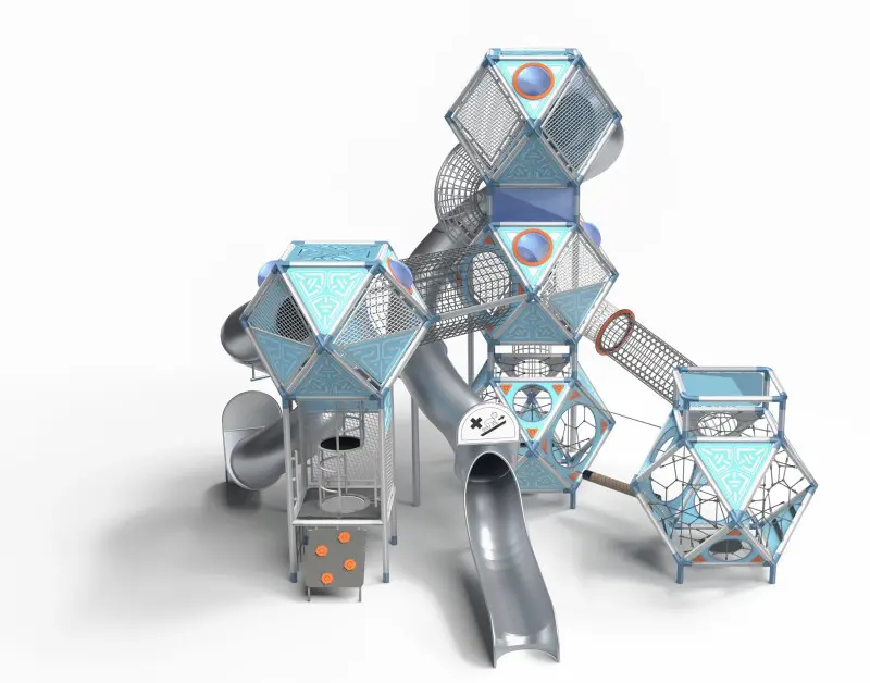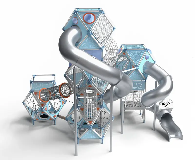 SFERO SPACE 5-1 er flaggskipet i serien – en gigantisk installasjon med fem sammenkoblede kuler og to lange sklier. Den fungerer som et arkitektonisk landemerke. Med plass til opptil 71 barn byr den på uendelige lekemuligheter: ståltunneler, tautunneler, stiger, balansetau og komplekse nettstrukturer. Det ultimate valget for store parker eller skolegårder. Fargetema: Grå/blå (Space).