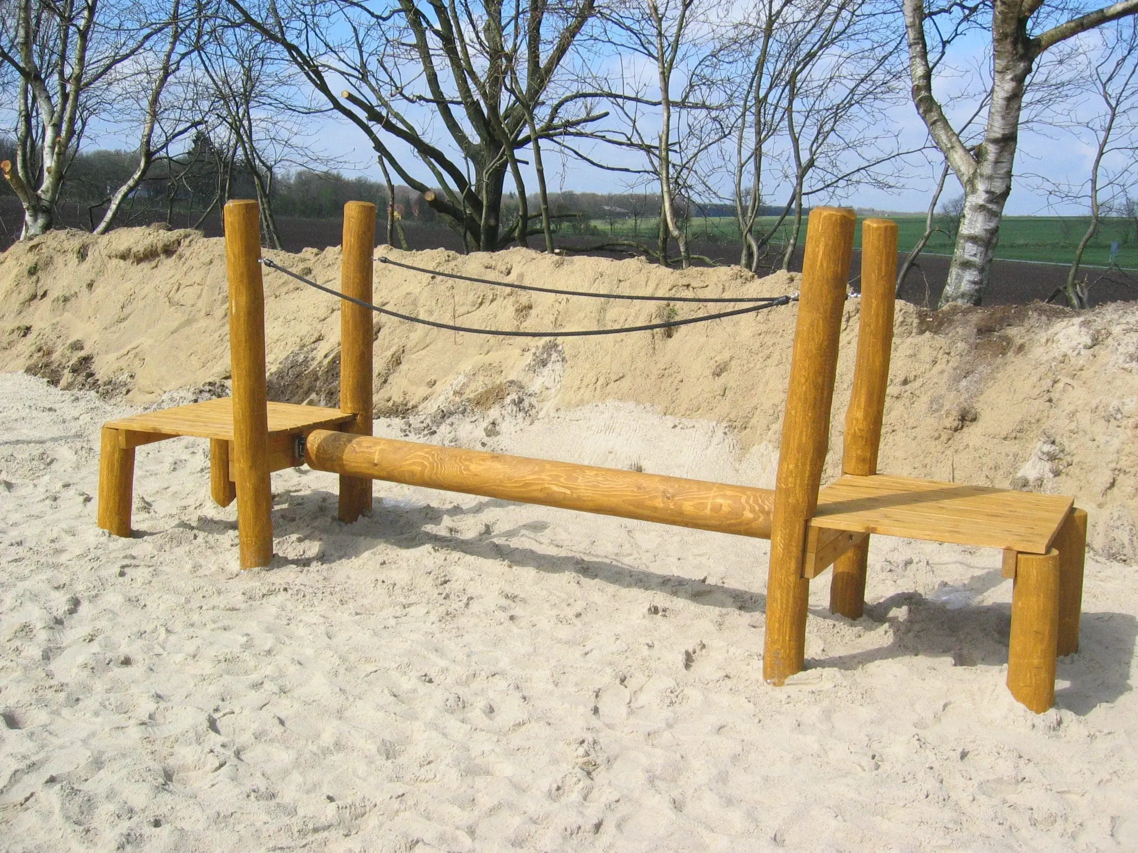 2 plattformer forbundet med en 2 meter lang rullende stamme med kulelager i rustfritt stål. Barnets balanse utfordres i stor grad når stammen ruller og tauene er bevegelige.