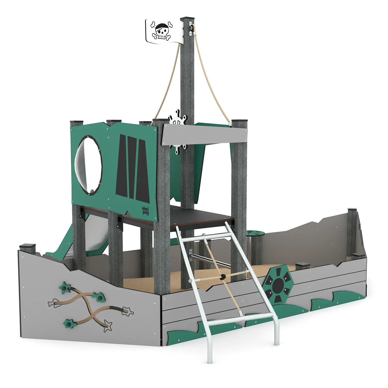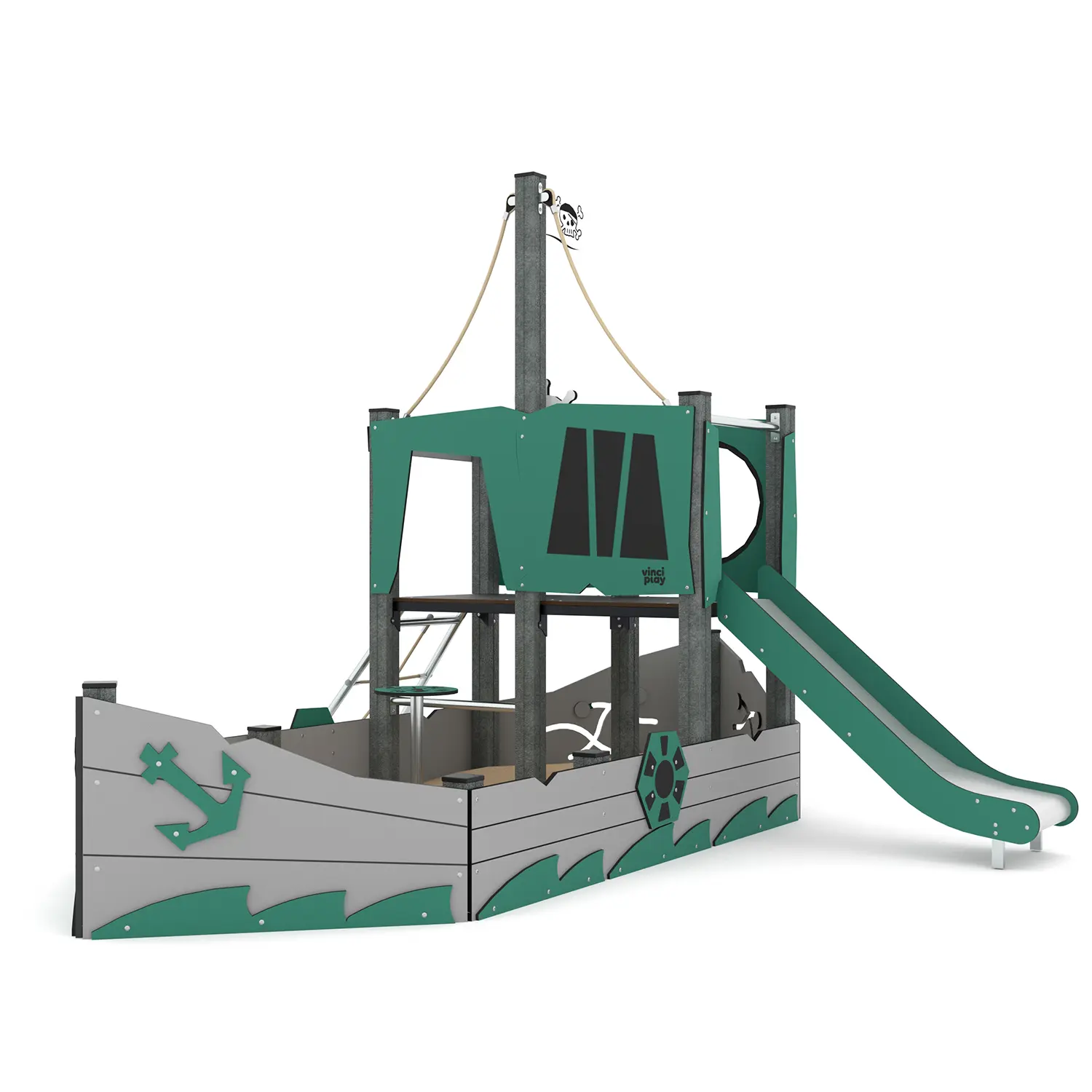Slide laget av rustfritt stål med sider laget av resirkulerte HDPE-plater, motstandsdyktige mot atmosfæriske forhold.