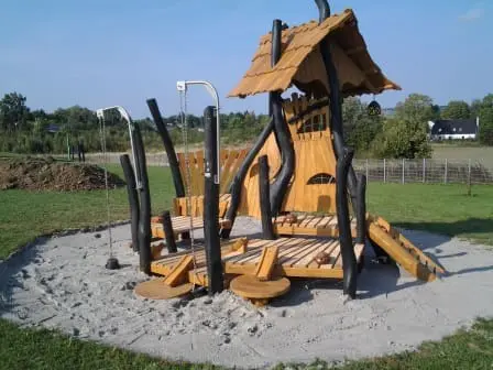 Temalekplassen er utformet etter Klods-Hans med dyrefigurer, en sandkasse for gjørmekaker, en prinsesse som venter i et (leke)tårn og hovedpersonen selv.
