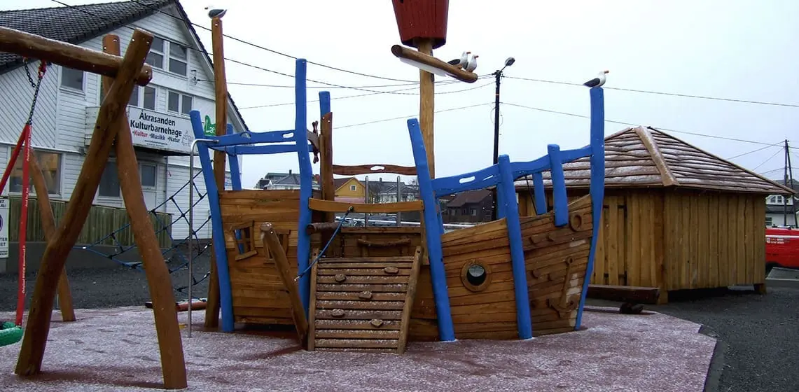 Åkrasanden kulturbarnehage. Rehabilitering av uteområde ble ferdig sommeren 2013. Åkrasanden kulturbarnehage ligger fint til nær stranden og sjøen på Karmøy. Det var derfor naturlig å velge et skip til barnehagens ute område. Et skip de voksne og barna kunne dra på oppdagelsesferd med helt til Amerika, på hvalsafari i Sørishavet, lete etter Nordpolen og julenissens verksted. I sandlandet har de butikk, kafe, sand bord, skattkiste og levegg av eik for nordavinden.