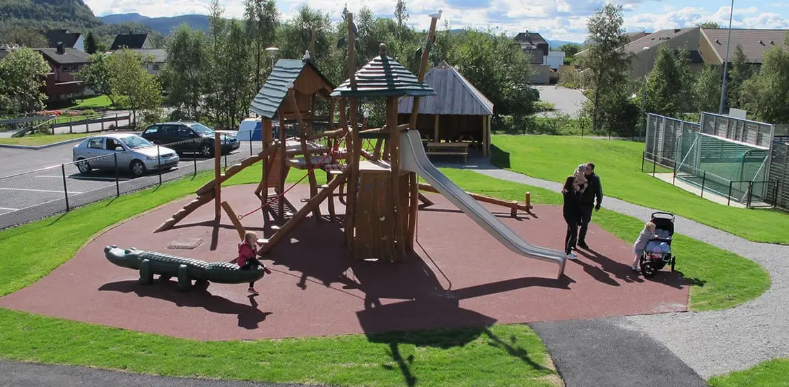 Plass støpt gummidekke i fint fargespill under lekeapparatene. Gummidekket tåler den slitasje den utsettes for. CADO sandland holder sanden på plass i et begrenset område som resulterer i mindre slitasje og holder vedlikeholdskostnader nede.