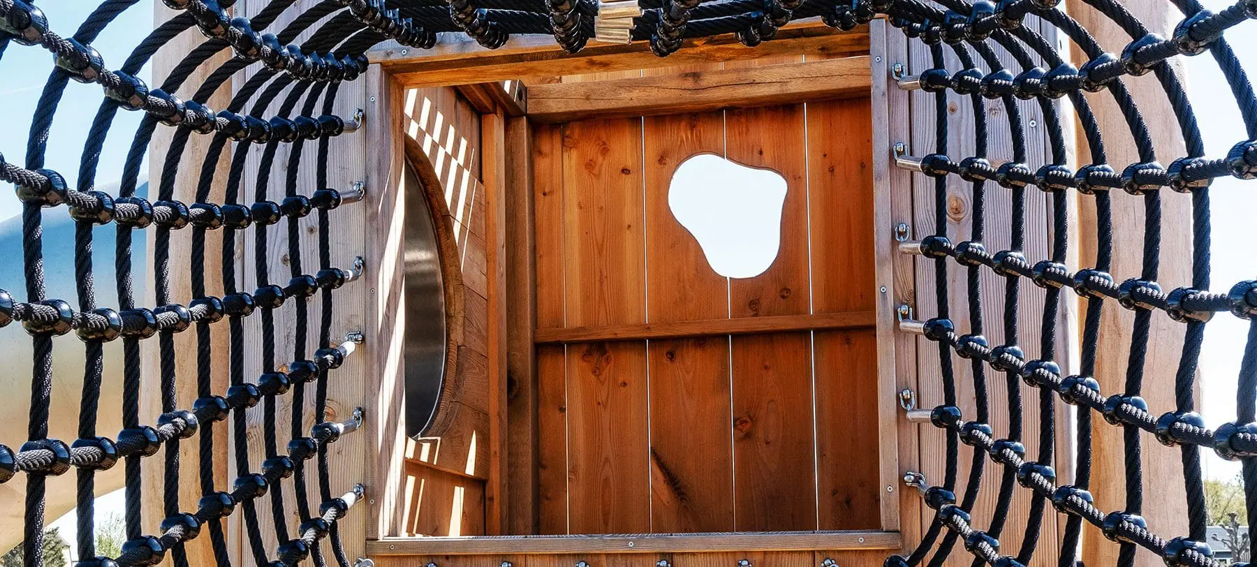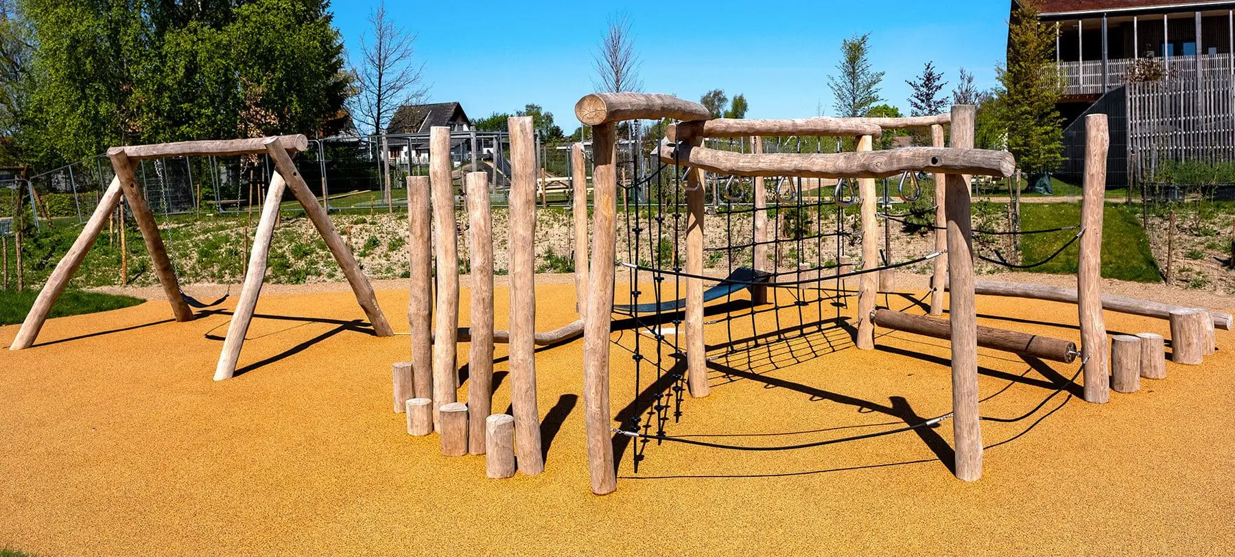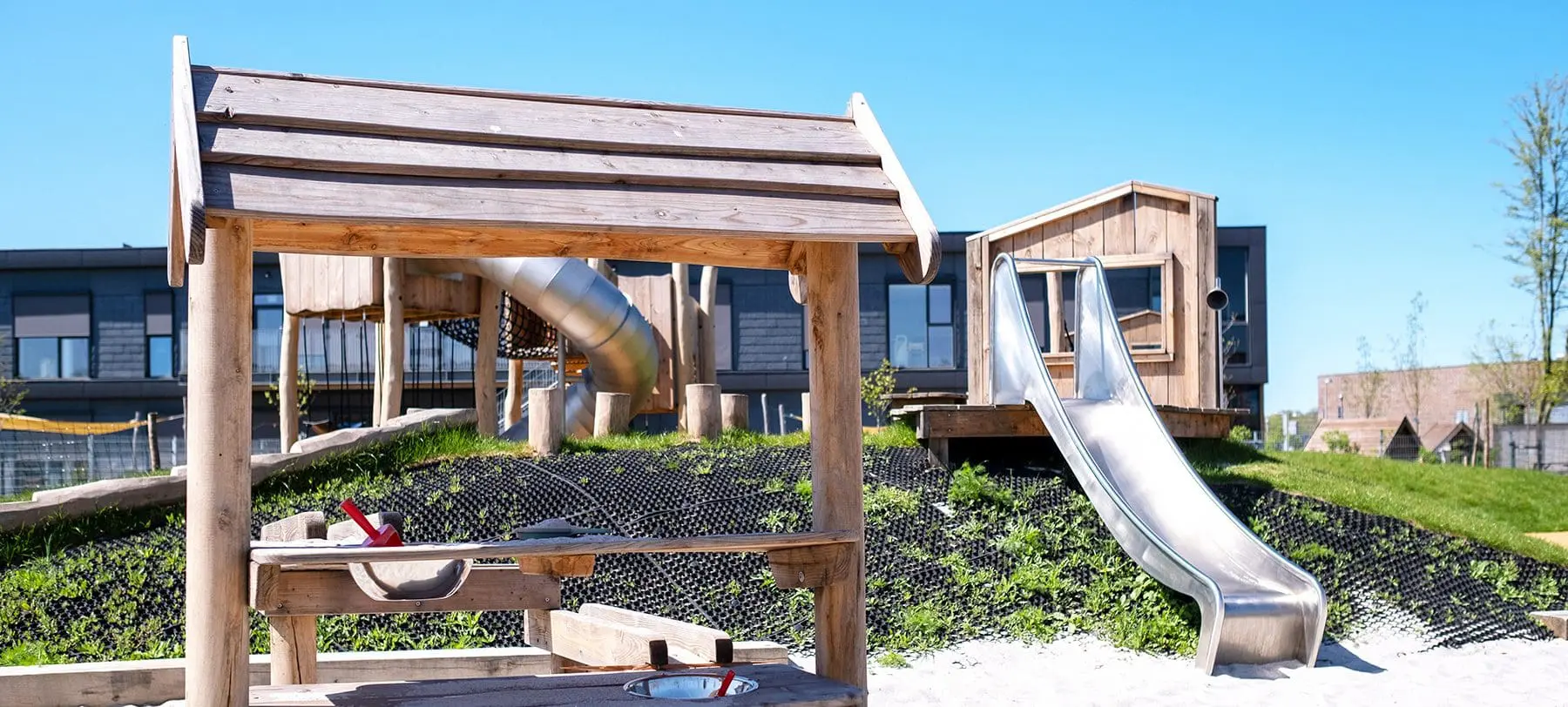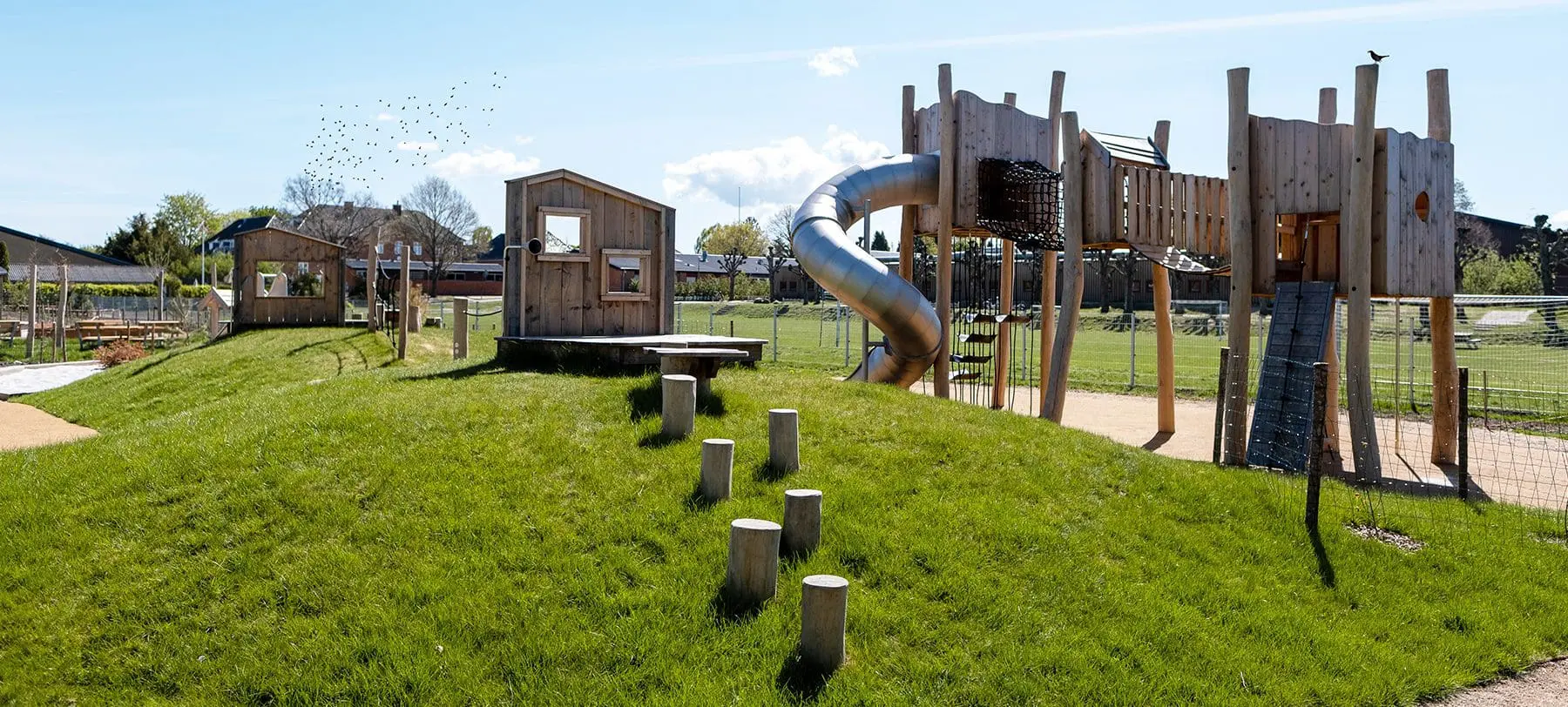 Områdets naturlekeplass har klatretårn, balansebaner, sklier og husker. Her er det fysisk utfordrende baner for barn i alle aldre, og de er lagt opp slik at det er flere veier frem og tilbake mellom områdene. Vi har også valgt å utvide områdets sandkasse, slik at det blir plass til et gjørmekjøkken der de minste kan leke med sand og gjørme og delta i ulike rolleleker.