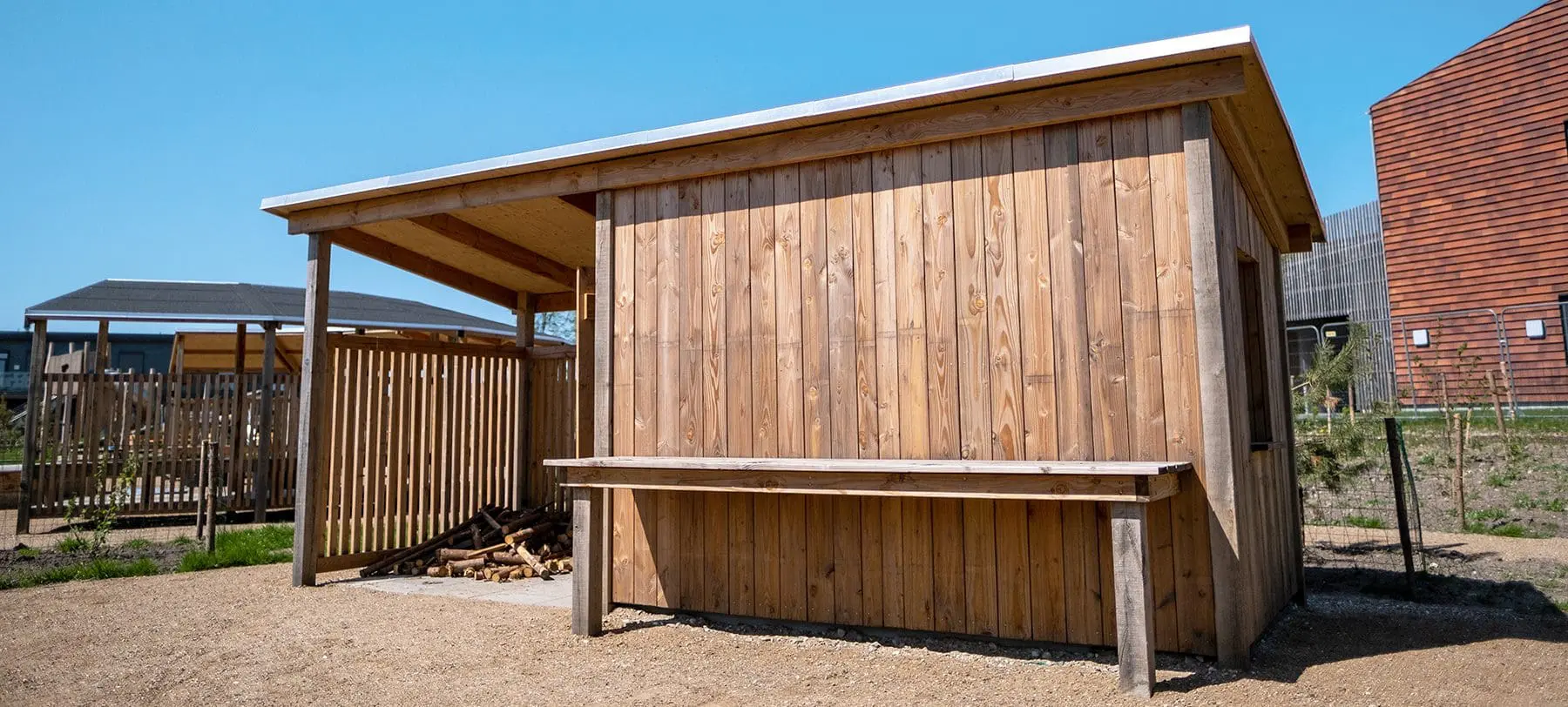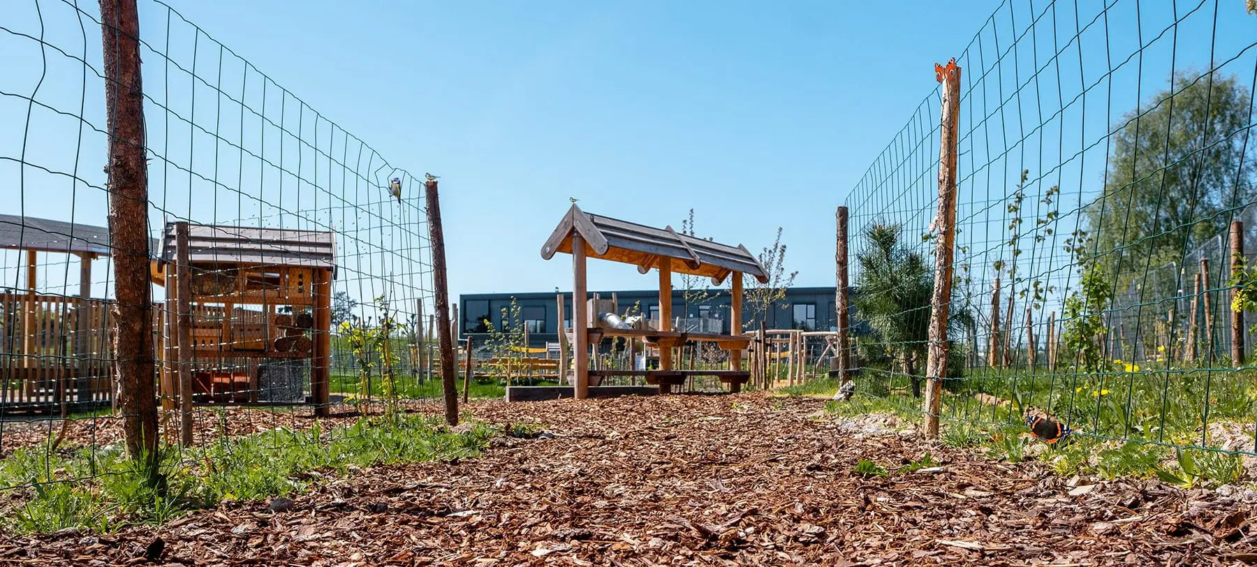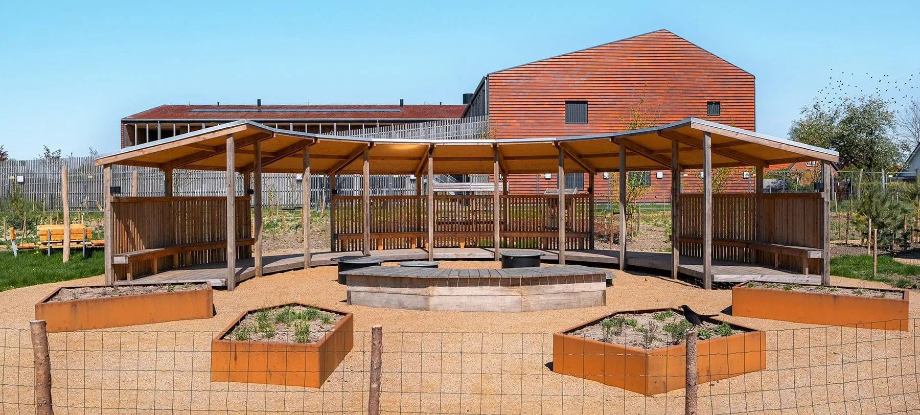 I hjertet av lekeplassen ligger vår spesialdesignede bålplass. Det er et samlingssted der det er god plass til at mange barn kan sitte eller overnatte under tak. Bålplassene, blomsterkassene og den lille scenen er alle samlet rundt bålplassen i en sirkelform som gjør det enkelt å følge med på hva som skjer rundt lekeplassen.