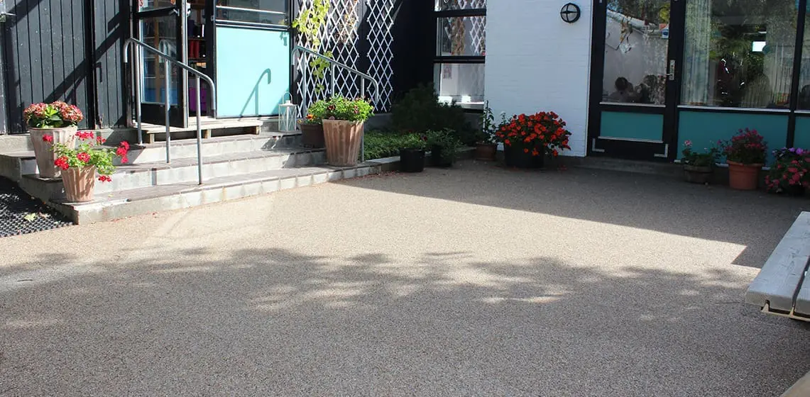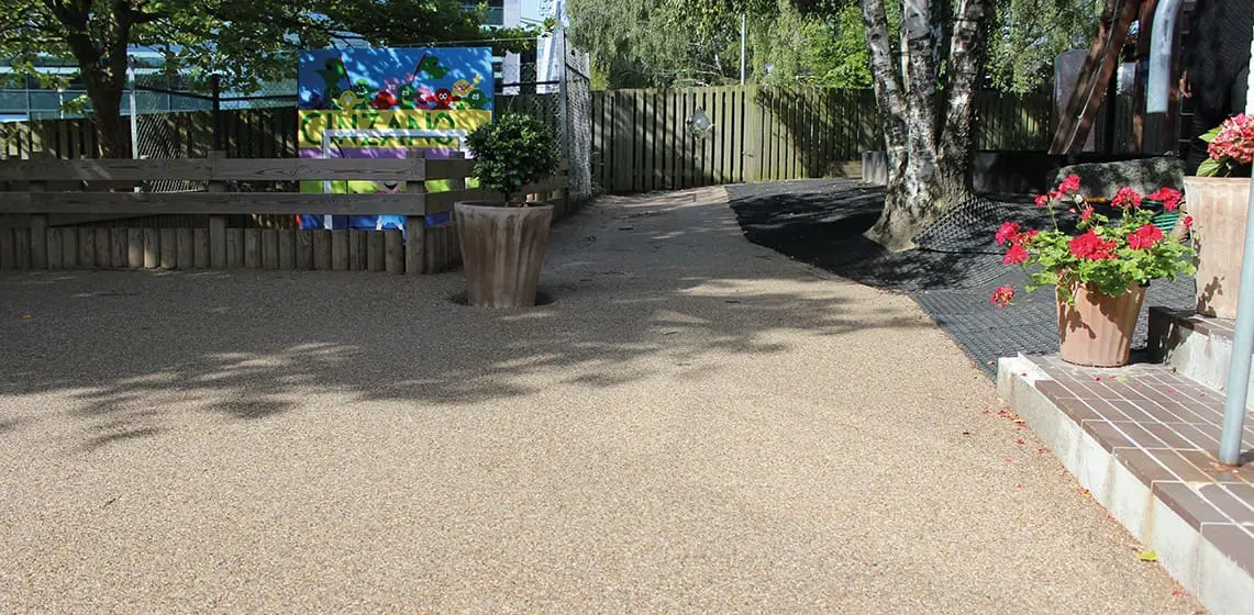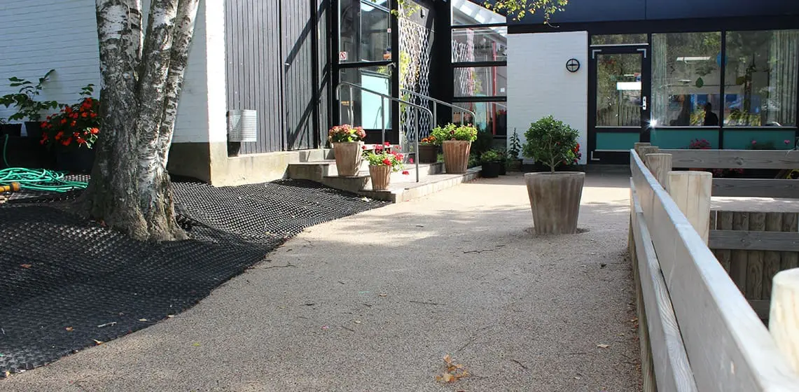 På baggrund af dette blev der valgt en CADO Flex Stone belægning. Denne type belægning er vedligeholdelsesfri og kunne samtidig afhjælpe institutionens udfordringer med vand, da belægningen er permeabel. Når børnene kommer fra sandkassen og bevæger sig over Surestone belægningen ryger sandet af og det giver en mindre vedligeholdelse af de indendørs arealer.