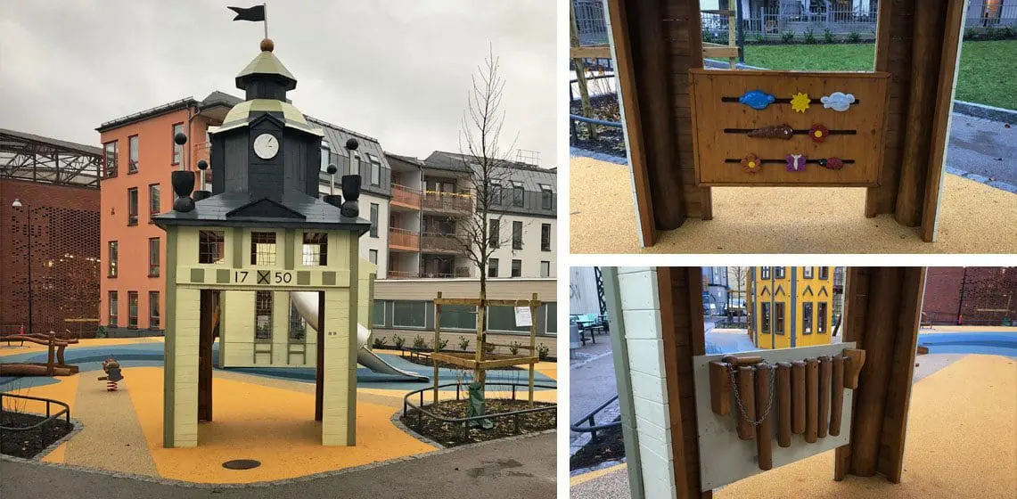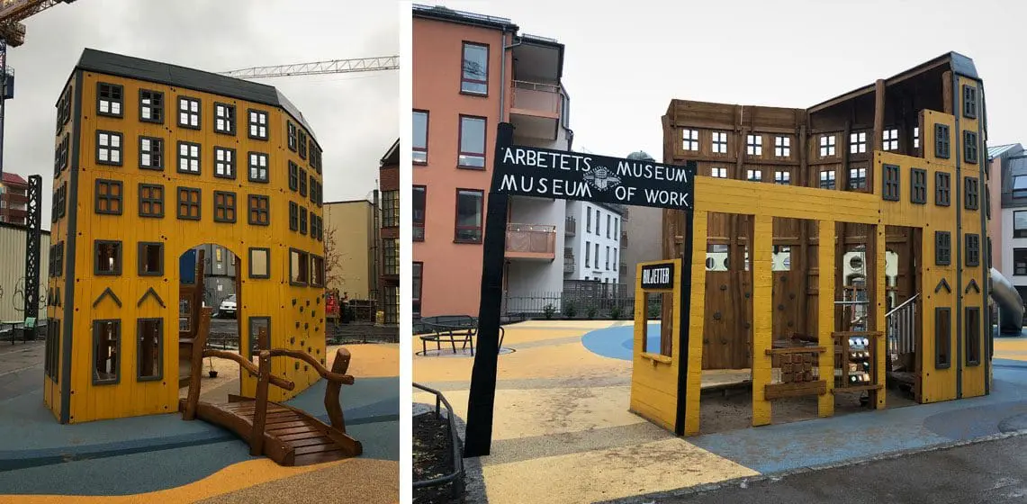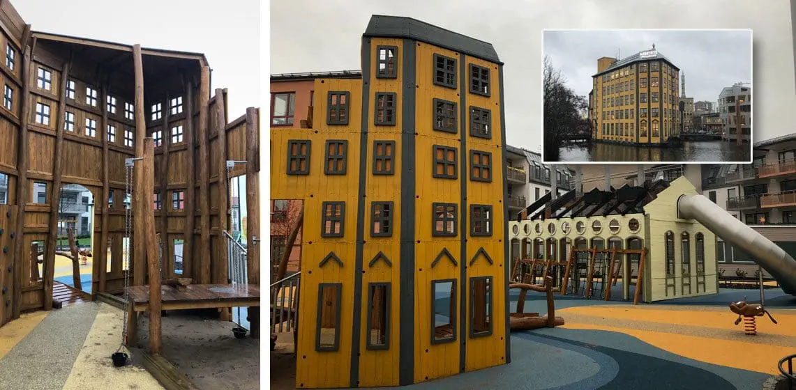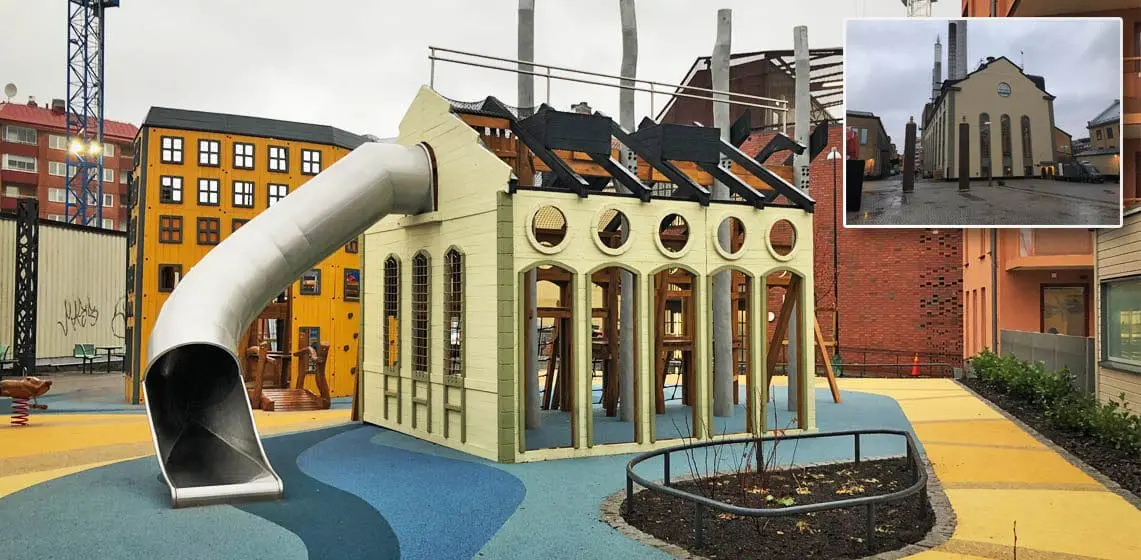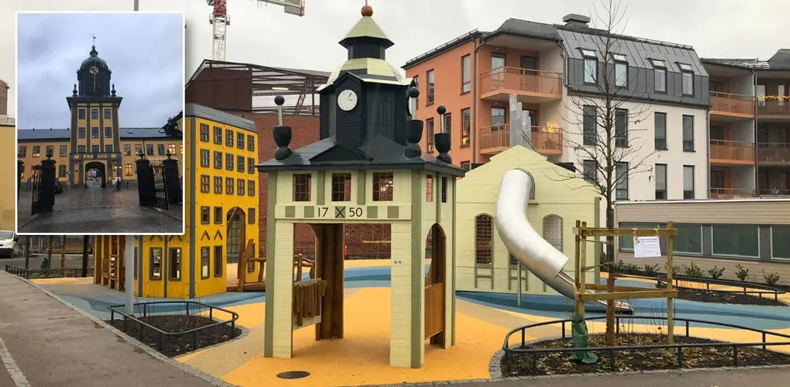 Lekeplassen i Norrköping skiller seg ut fra mengden. Her har vi gjenskapt tre kjente bygninger midt i et nybygd boligområde.