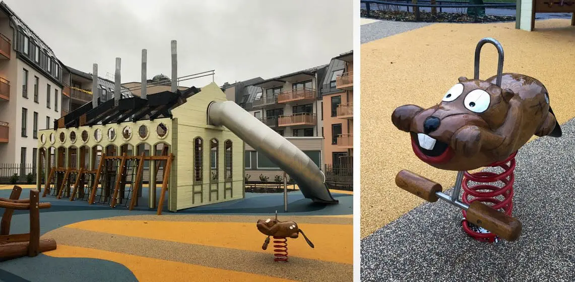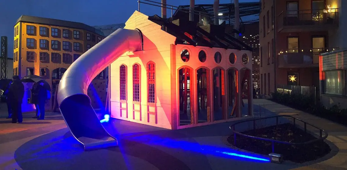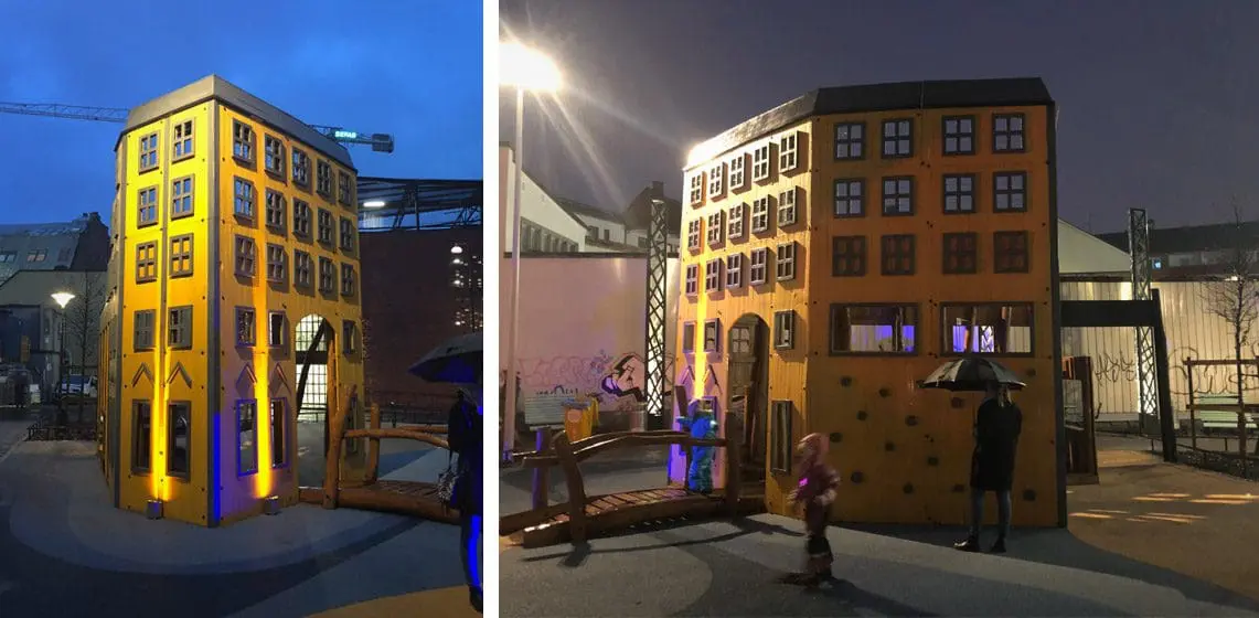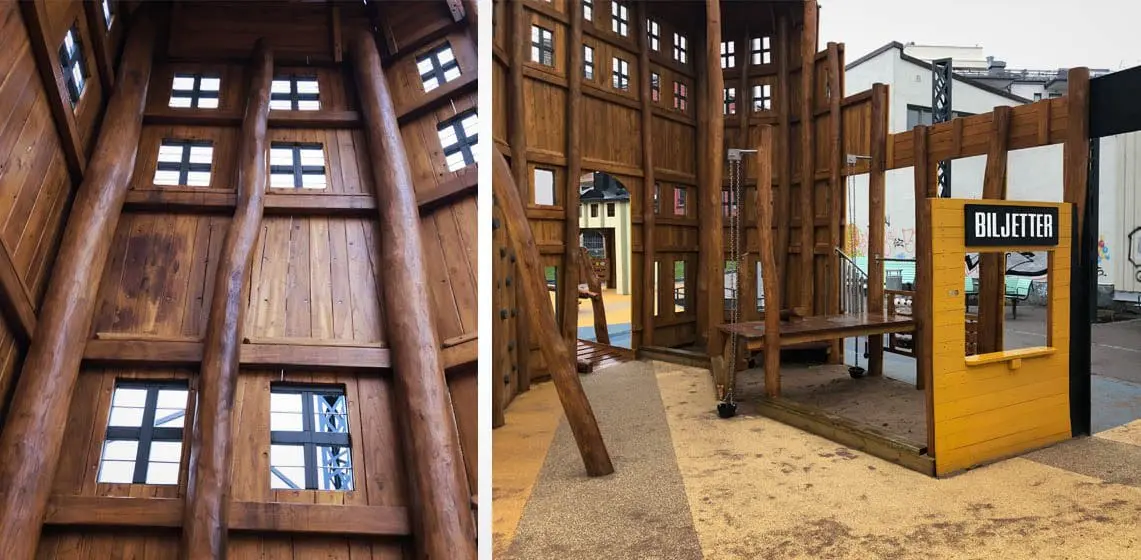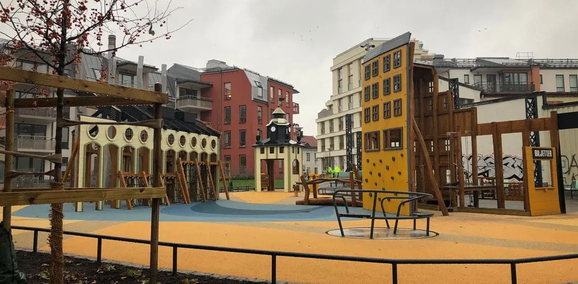 Lekeplassen i Norrköping skiller seg ut fra mengden. Her har vi gjenskapt tre kjente bygninger midt i et nybygd boligområde.