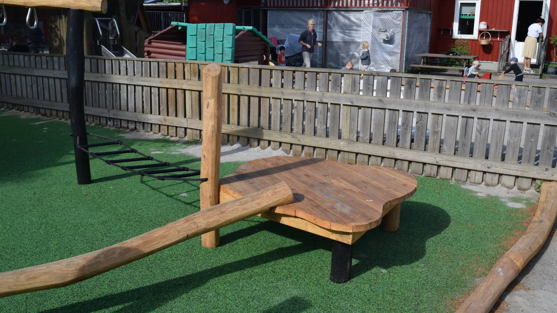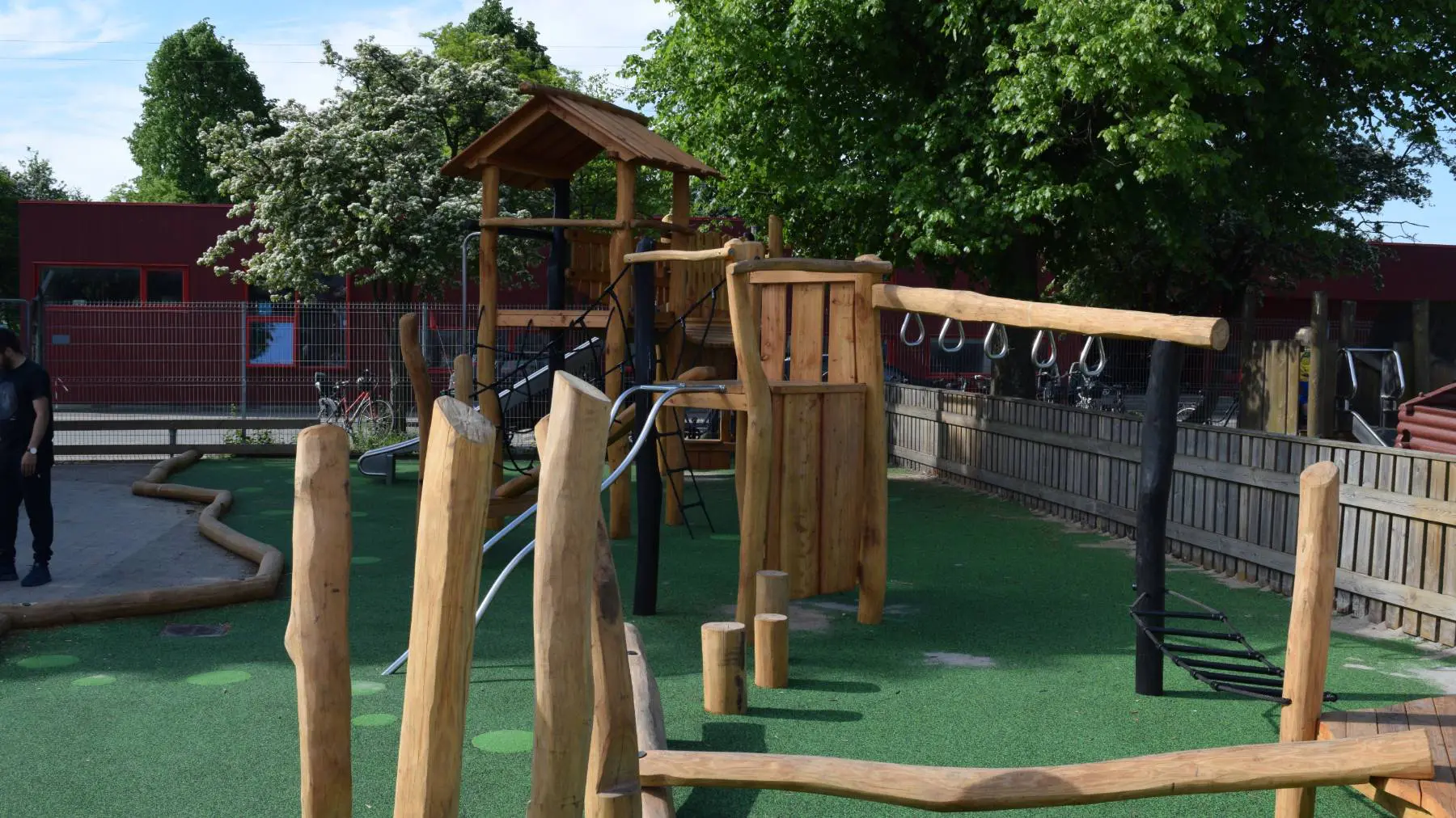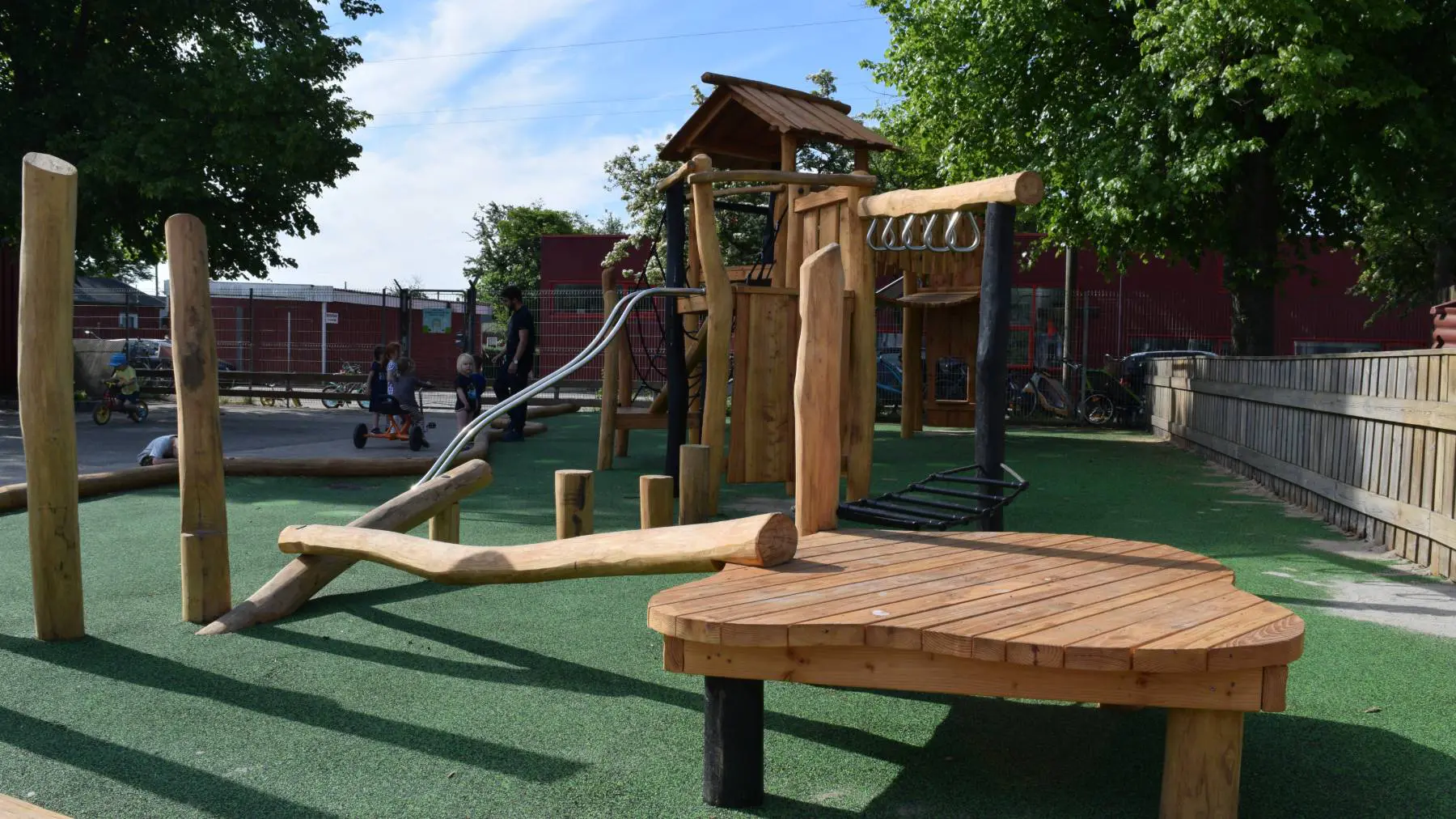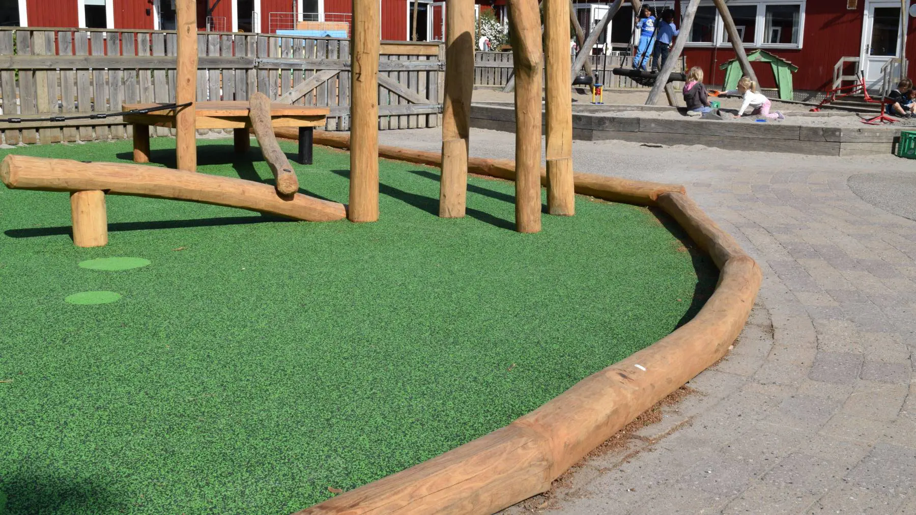 I den ene enden av lekeområdet prøver en jente å slå rekorden sin i armgang. I den andre enden leker en gruppe sisten opp og ned rutsjebanen. Hele lekeplassen er dekket av en myk, støtdempende fallmatte som oppmuntrer til fartsfylt og energigivende lek.