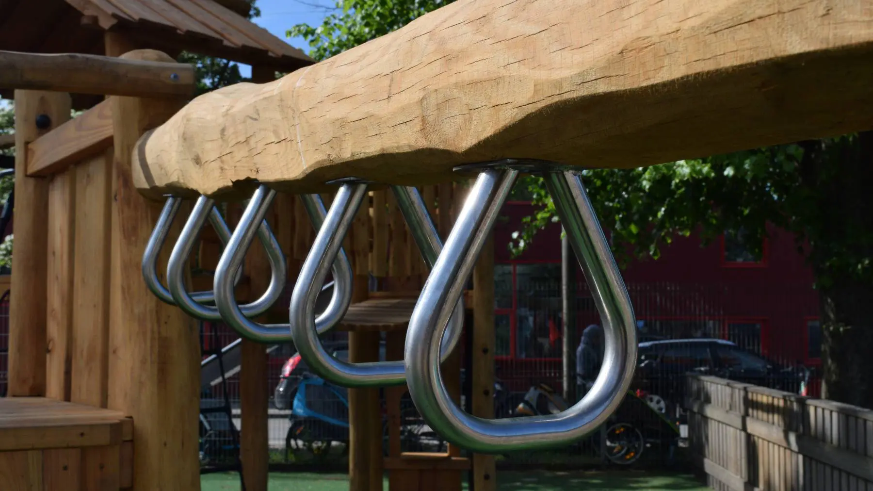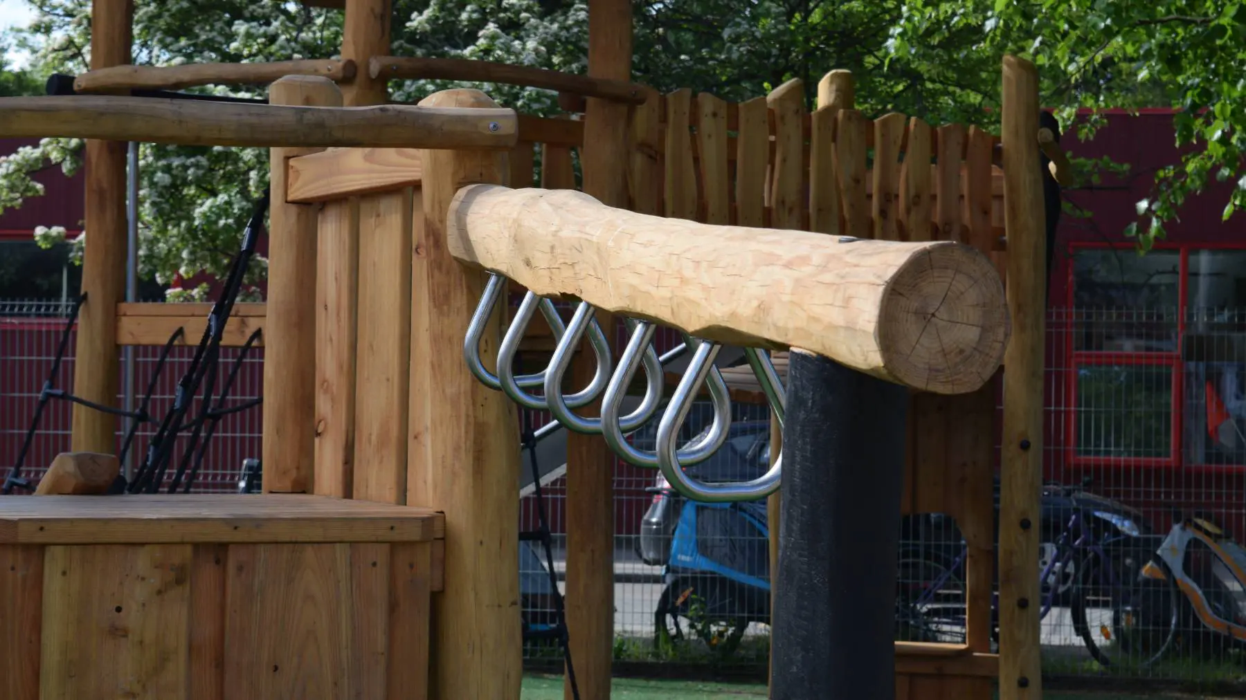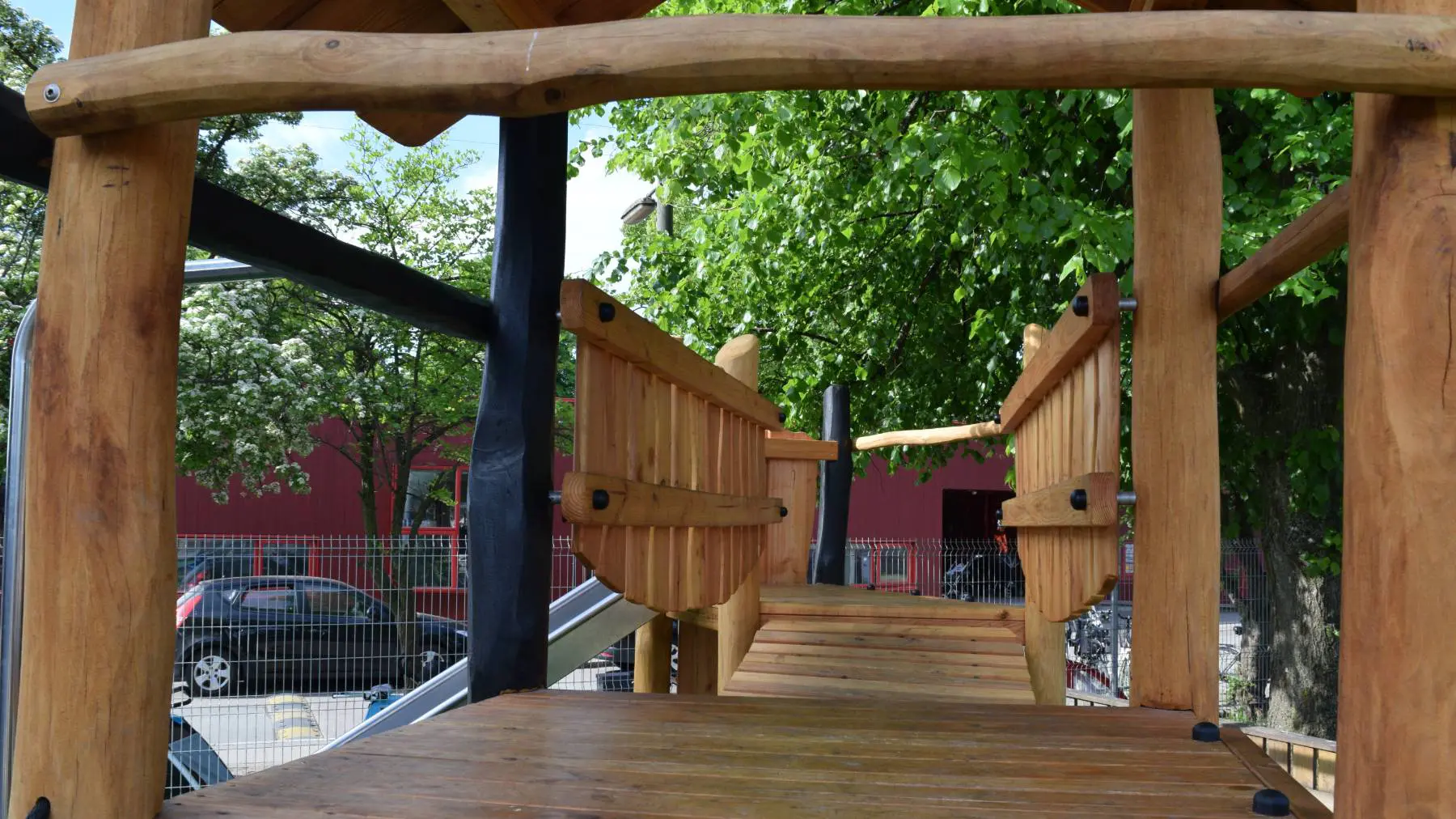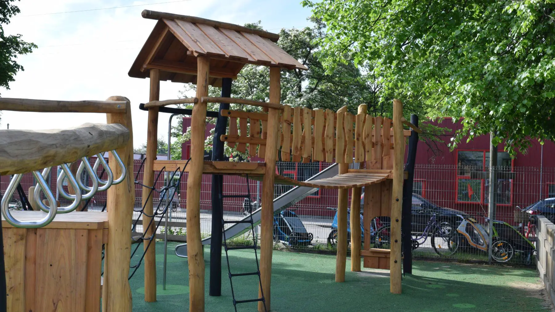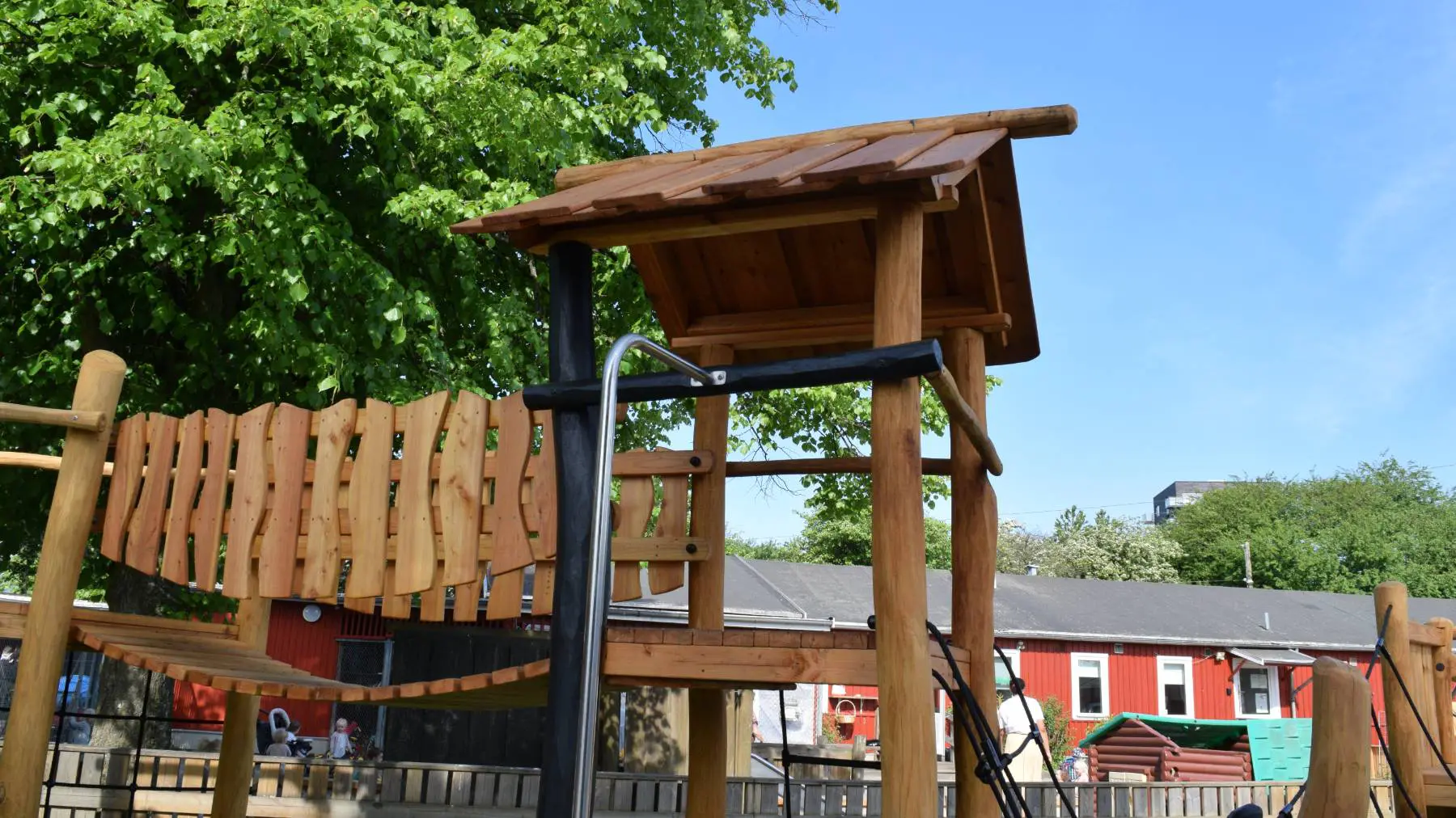 I den ene enden av lekeområdet prøver en jente å slå rekorden sin i armgang. I den andre enden leker en gruppe sisten opp og ned rutsjebanen. Hele lekeplassen er dekket av en myk, støtdempende fallmatte som oppmuntrer til fartsfylt og energigivende lek.