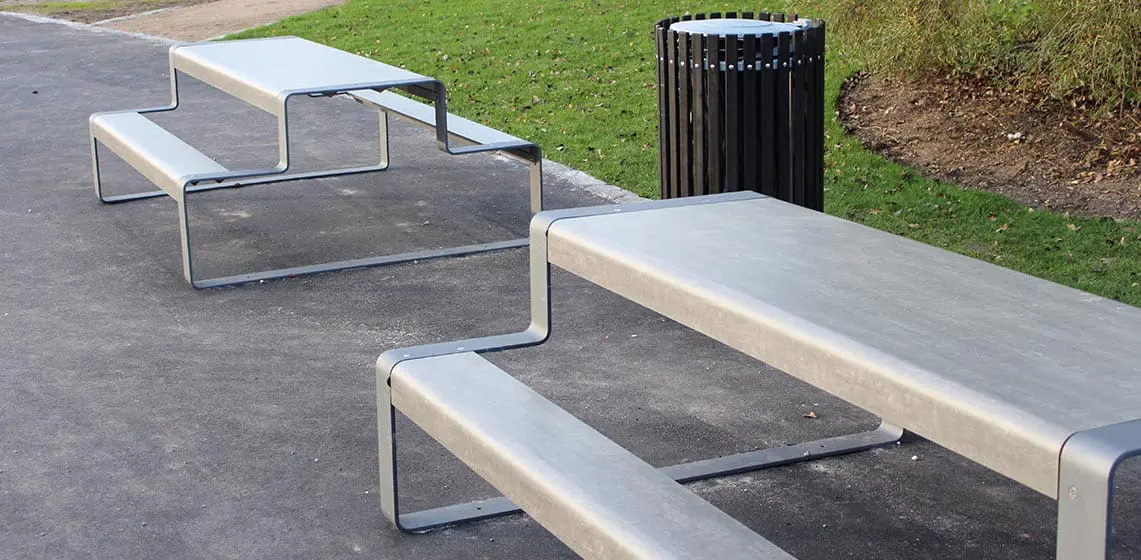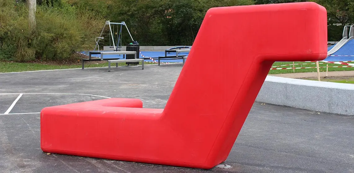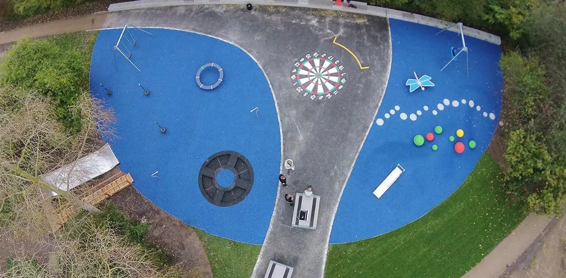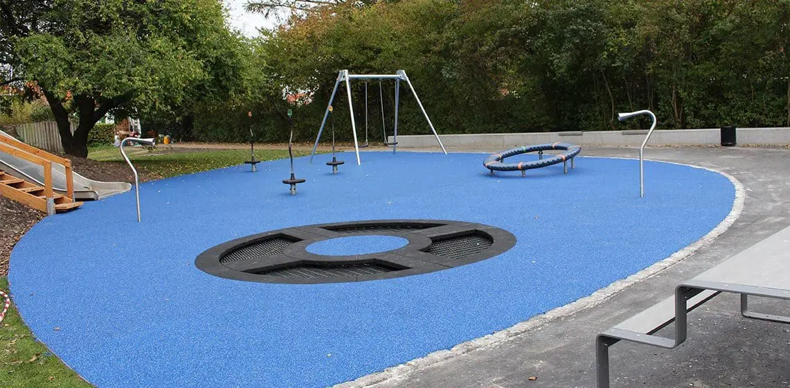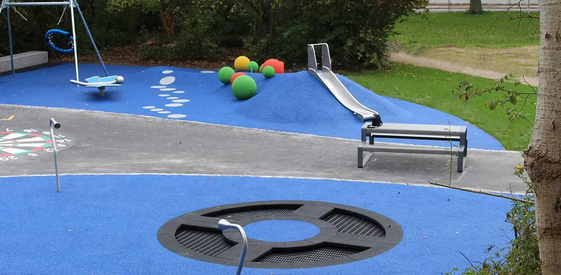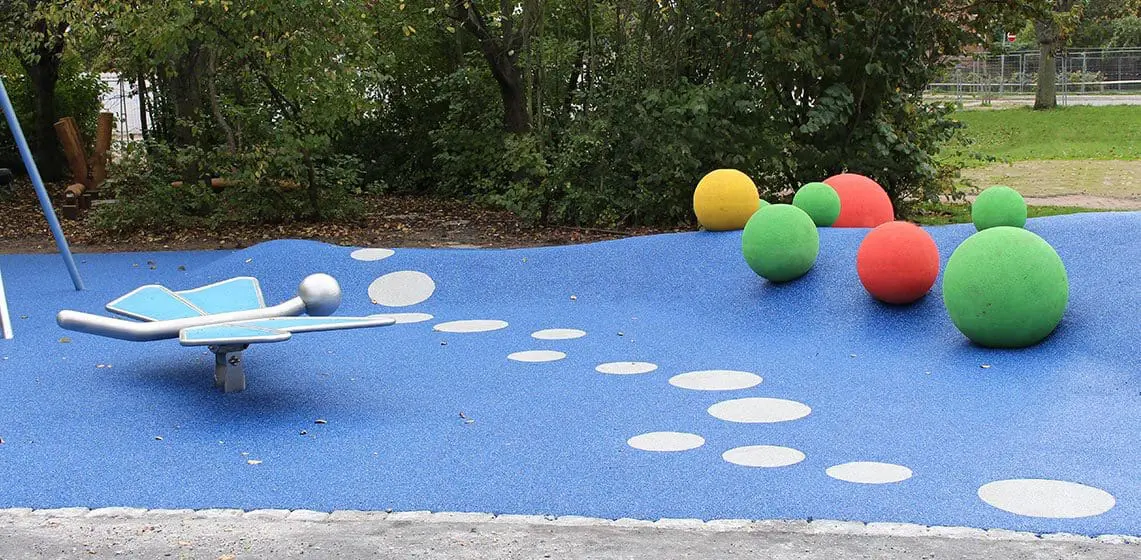 Lekeplassen er enkel og innbydende med utstyr i rustfritt stål og gummiballer i klare farger. Materialvalget sikrer lite vedlikehold, ingen hærverk og ingen skarpe gjenstander gjemt i bakken. Vi er stolte av den nye lekeplassen og er sikre på at området vil skape mange timer med lek og bevegelse for familier og barn i alle aldre.