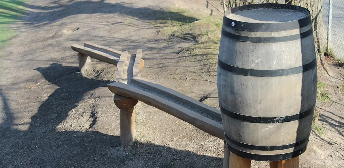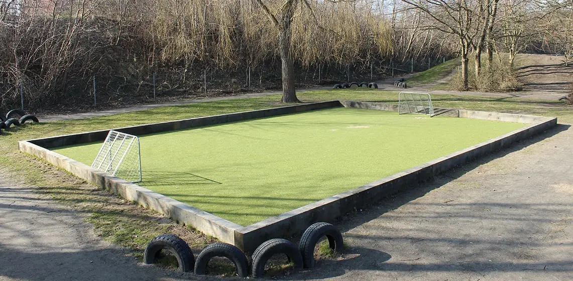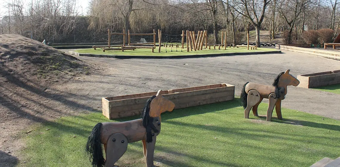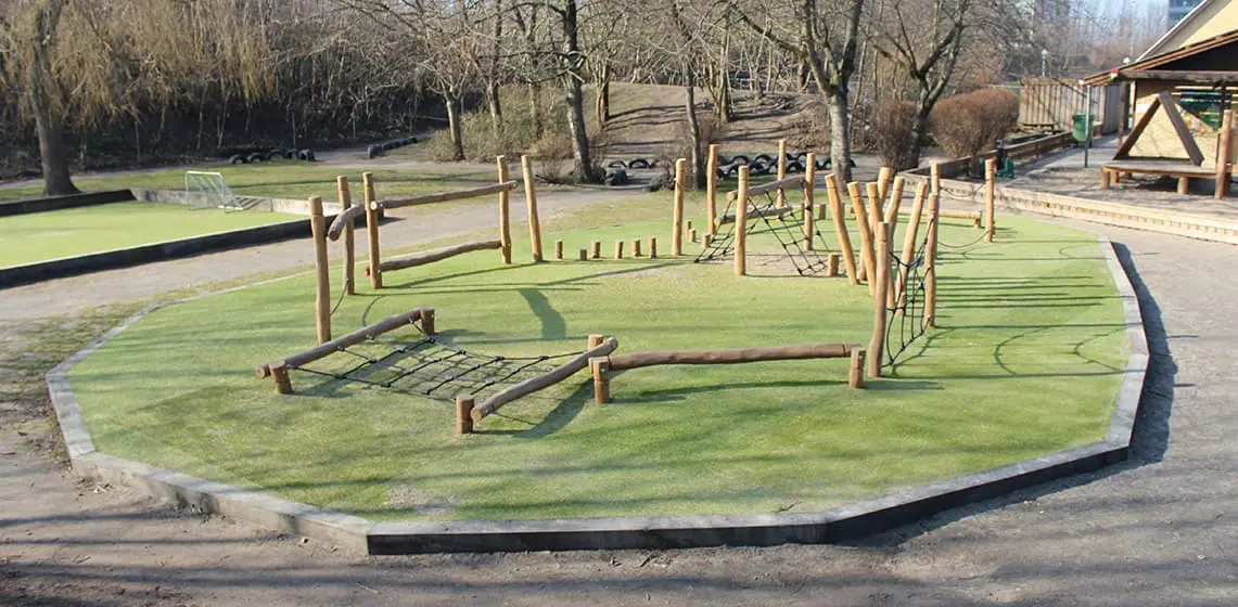 Legepladsen er primært udført i robinie for at respektere det flotte grønne område. Fokus har været på at inspirere en bred aldersgruppe til leg og samvær. Den nye legeplads rummer mange aspekter i både motoriske udfordringer og rolleleg.