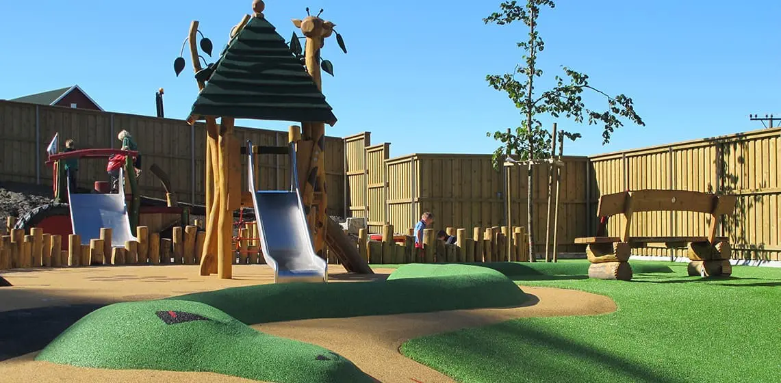 Gummidekket og kunstgress gjør at barnehagen har svært lavt vedlikeholdsbudsjett.